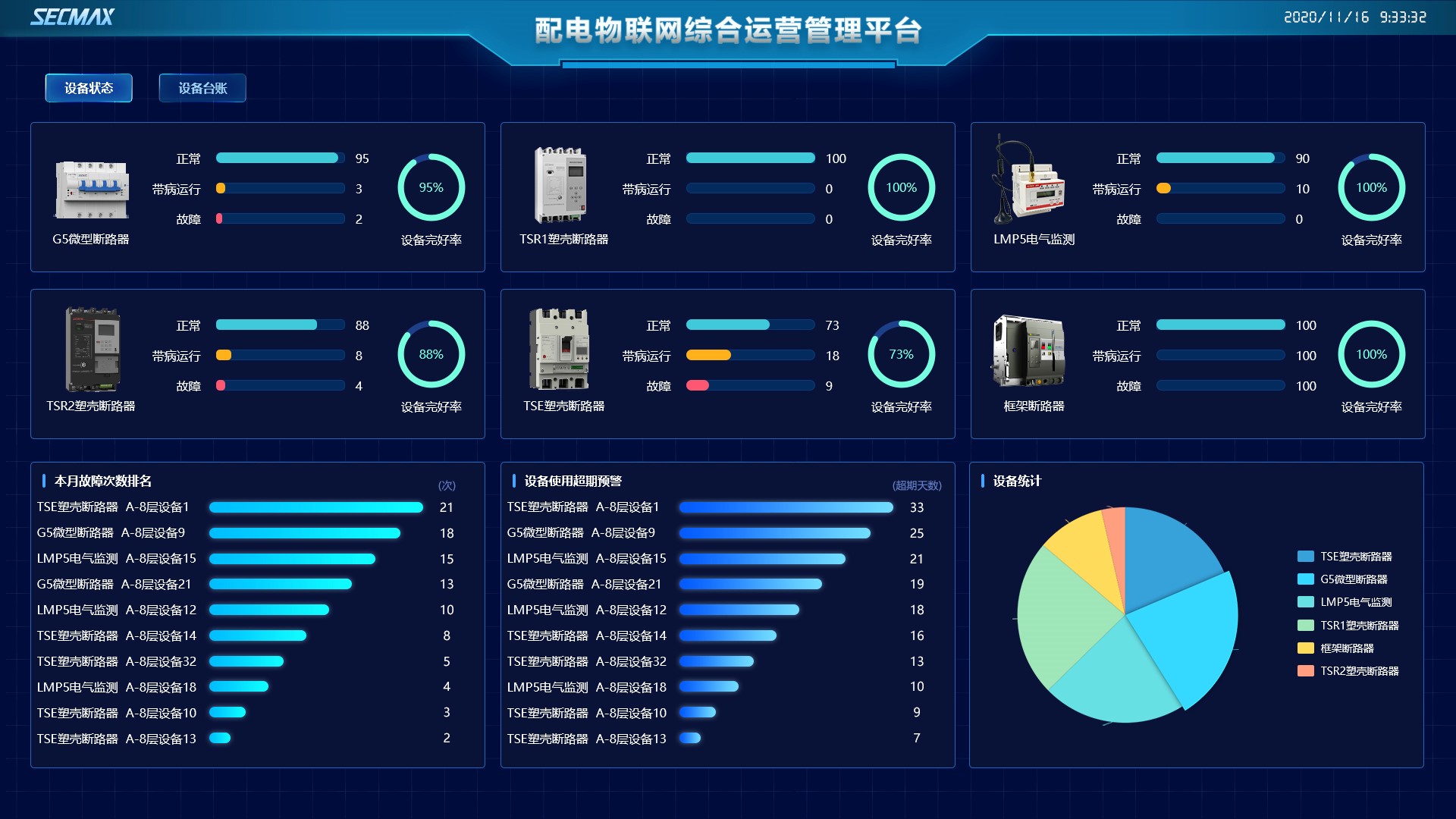 展示各類設(shè)備運行狀態(tài)、設(shè)備故障次數(shù)排名、設(shè)備使用超期預(yù)警。