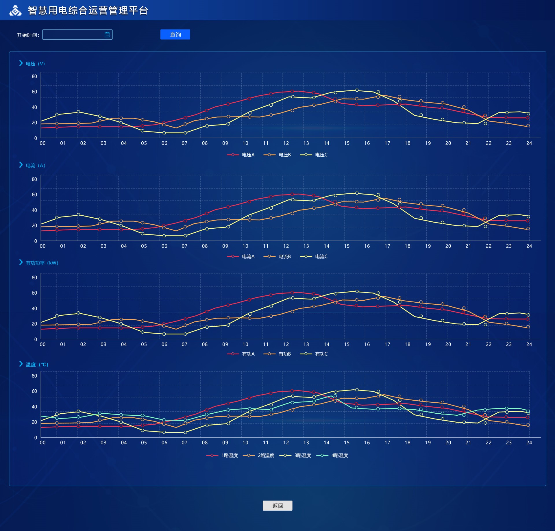 展示設(shè)備線路的電流,電壓,功率,溫度走勢(shì)圖。
