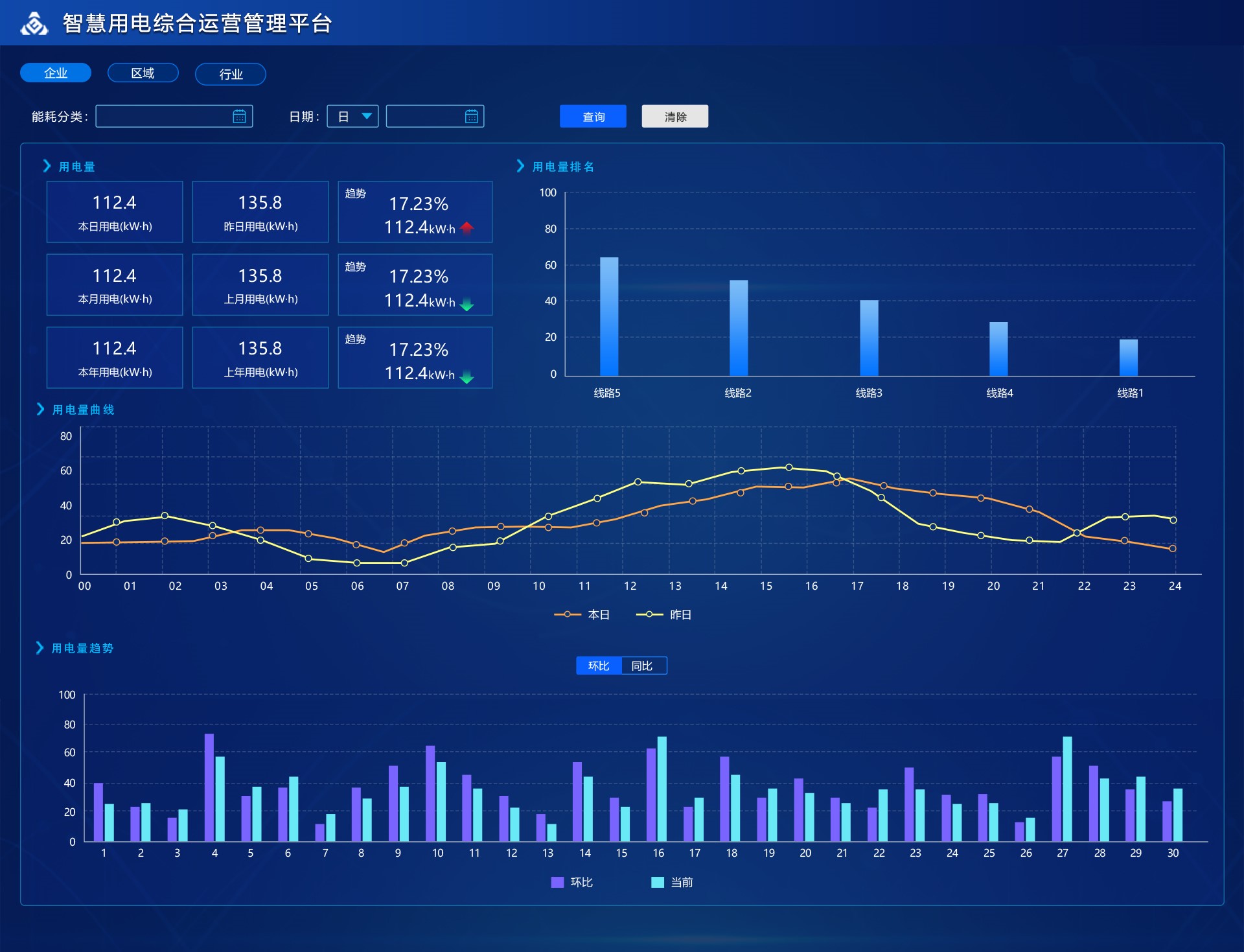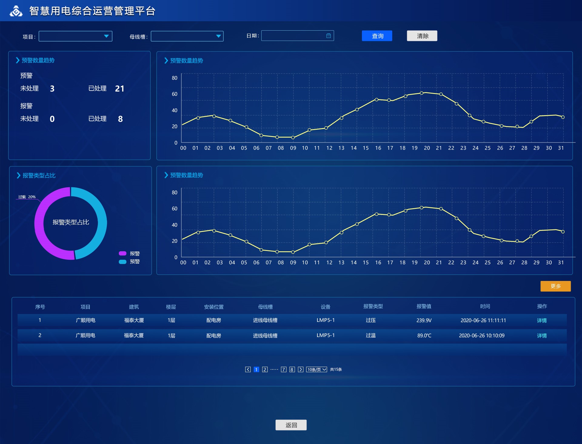 對(duì)管轄區(qū)域內(nèi)用電情況進(jìn)行概括,一圖展示報(bào)警信息、電量統(tǒng)計(jì)、設(shè)備狀態(tài)、線路數(shù)據(jù)、檢修工單,管理人員概況,平臺(tái)界面條理清晰,布局合理。
