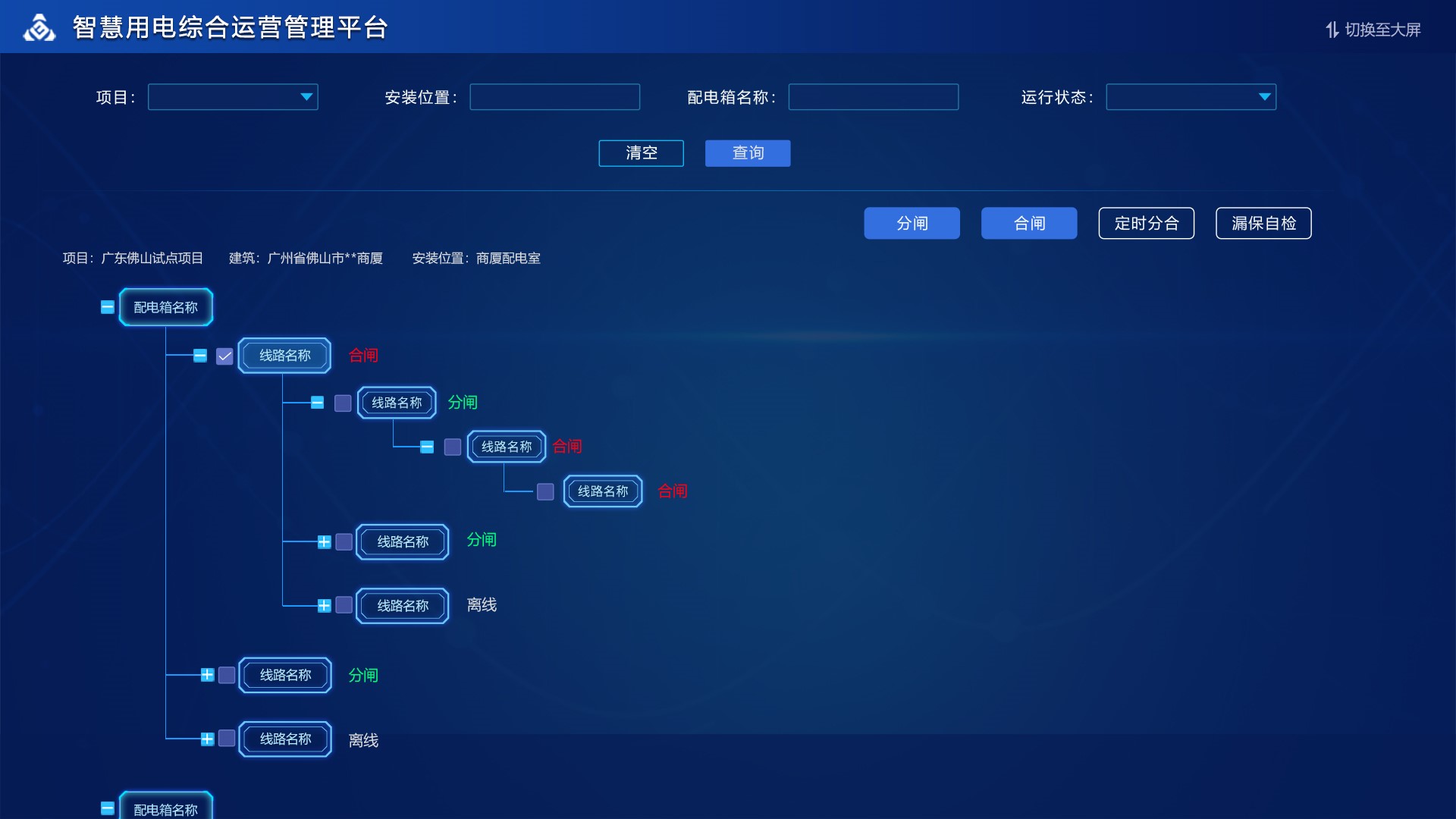 安裝的設(shè)備通過(guò)數(shù)據(jù)層級(jí)圖有一個(gè)直接的分布情況展示,并可做查看詳情,查看電氣參數(shù)以及指定分合閘操作。