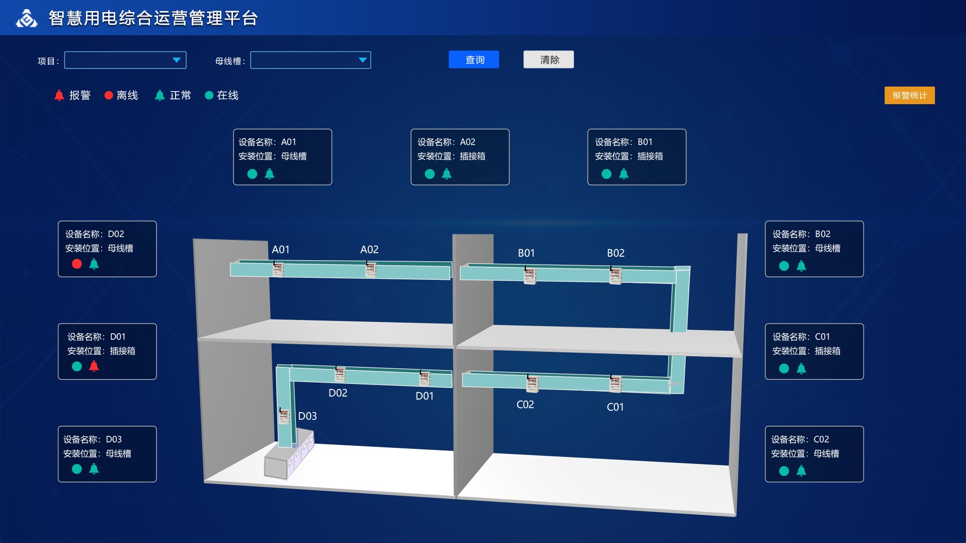 監(jiān)測(cè)母線槽,展示設(shè)備實(shí)時(shí)電氣指標(biāo)參數(shù)以及設(shè)備狀態(tài)。