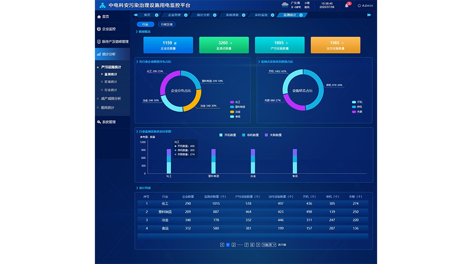 從行業或區域維度統計企業數量、企業監測點數量及狀態。